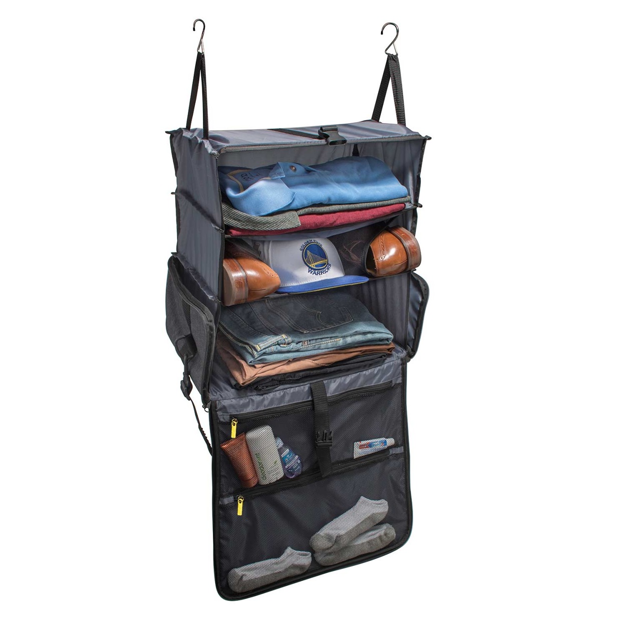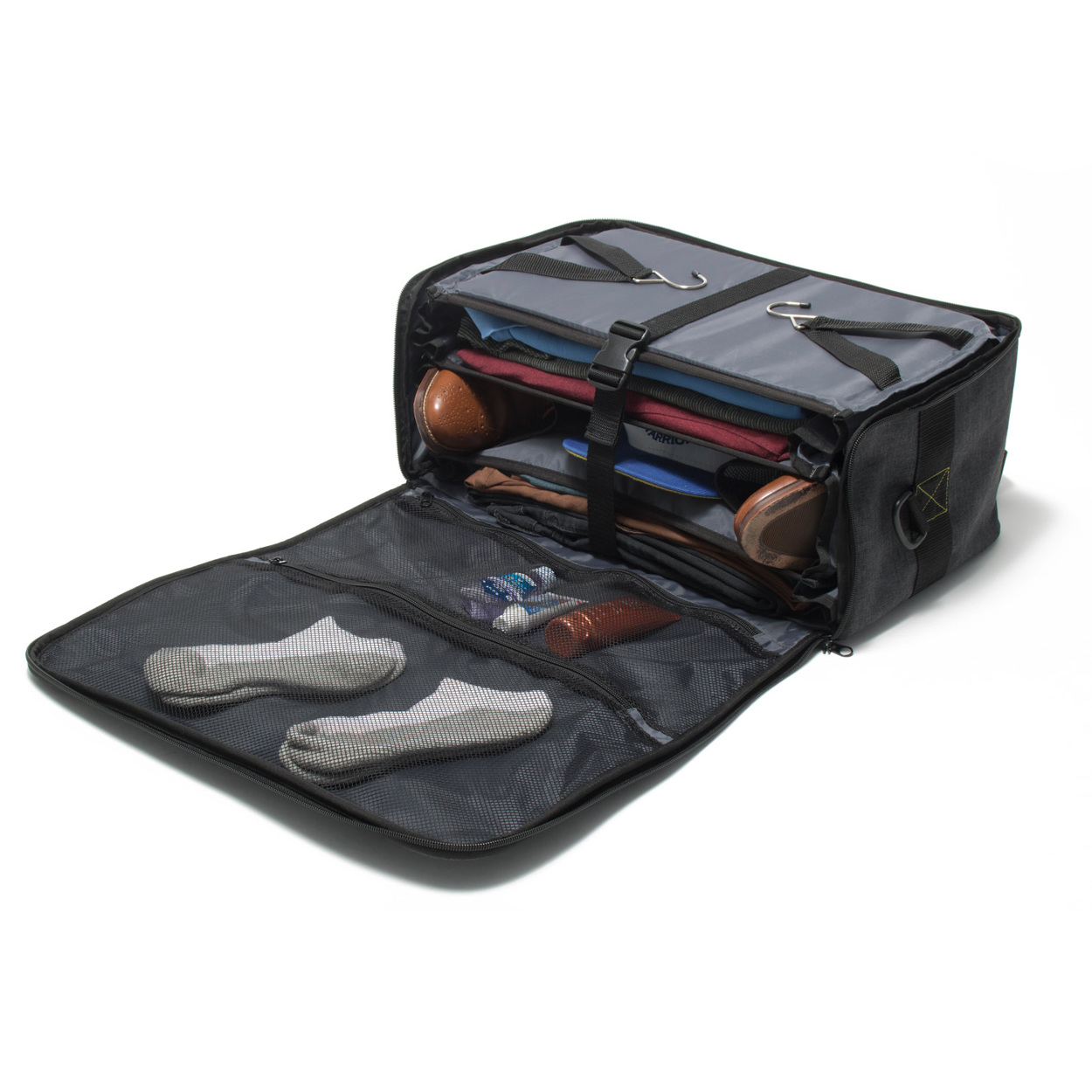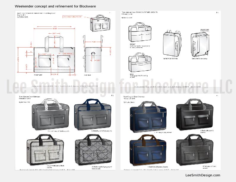 Design prompt: Streamline travel, no more forgetting items in hotel drawers/closets, cleanliness of drawers, and forget wasting time unpacking at destination and re-pack when departing. Even packing cubes can be confusing, as not all articles of clothing are visible without digging. And also combine a laptop- so user wouldn’t need to juggling 2 separate bags through security. We went for a redesign travel hanging-shelf product from 10 years prior to be a stand alone travel solution for 2-3 day trips, accommodate laptop, and organize personal accessories. It needed a shoulder strap, hand carry option, and ability to fit under most airline seats.