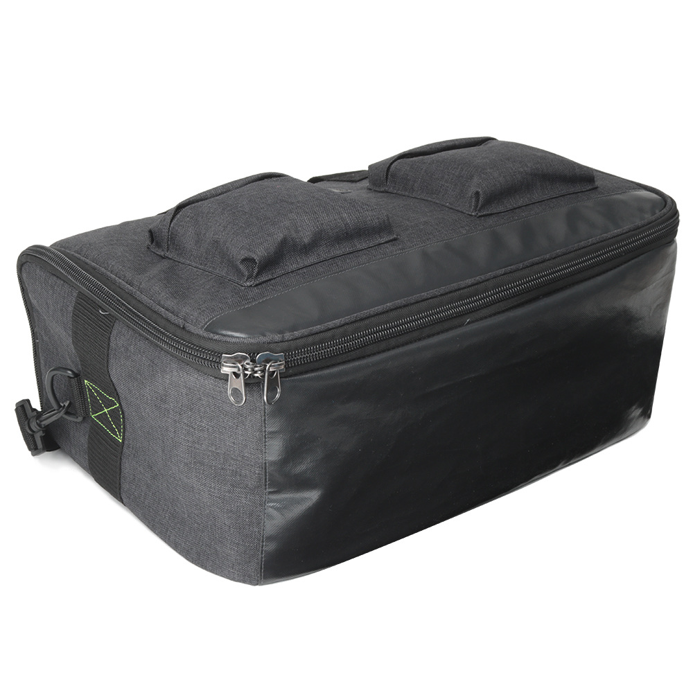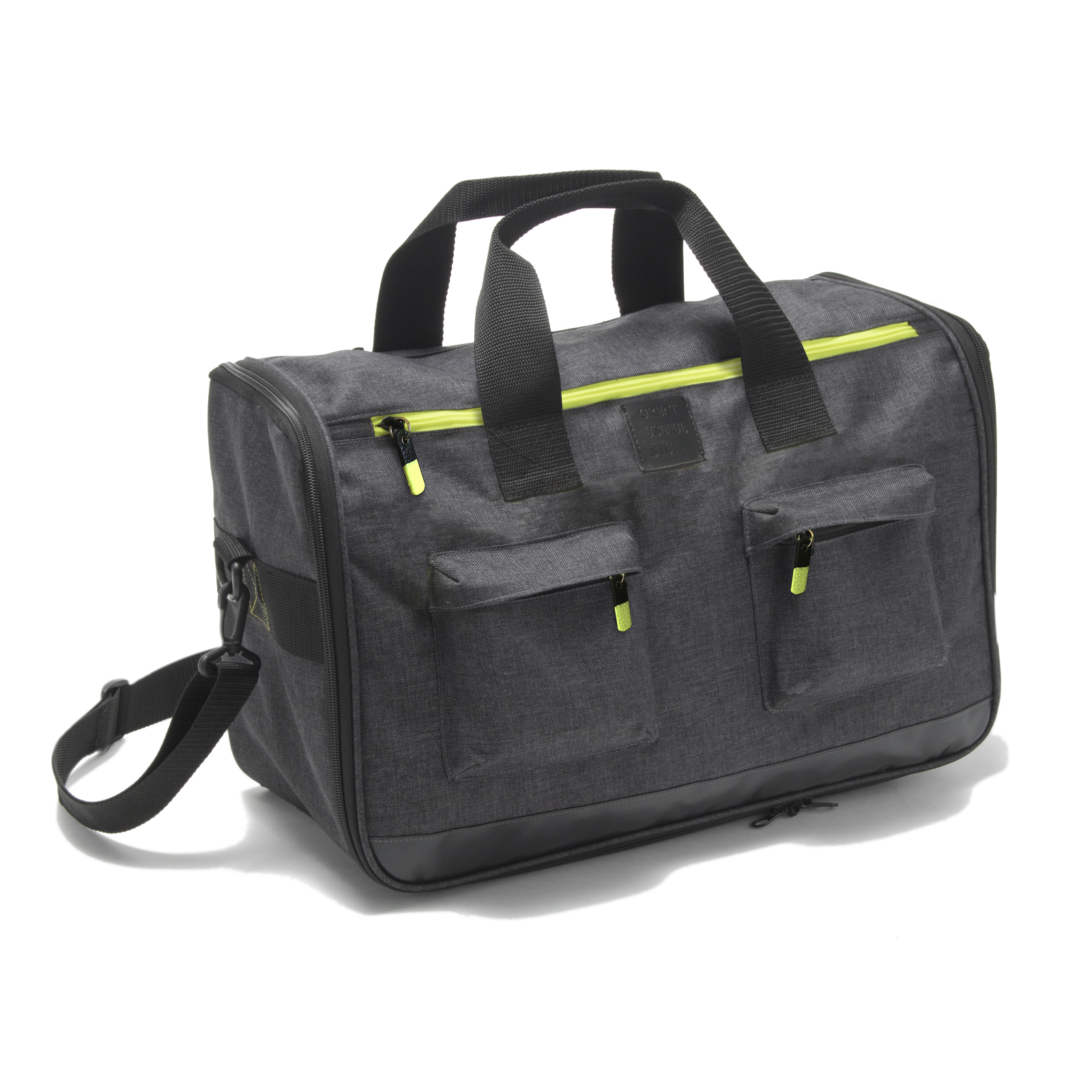 Design Solution: A single zip around with two zipper heads was both familiar and straight forward access, revealing two closet hooks to hang entire unit, and all clothing contents are visible at a glance. Exterior pockets house laptop, cords, and travel documents. Exterior fabric is cationic polyester (partially recycled) with a backside coating for water resistance, and a PVC coated water-proofed base. Neon yellow accents help the bag stand out in a sea of black travel cases.